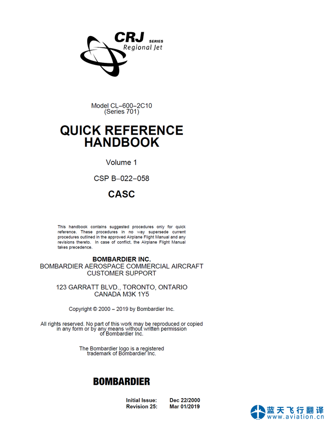 本次翻譯的CRJ700快速檢查單為第25版,2019年3月1日版本,分為上下兩冊(cè)。Model CL−600−2C10