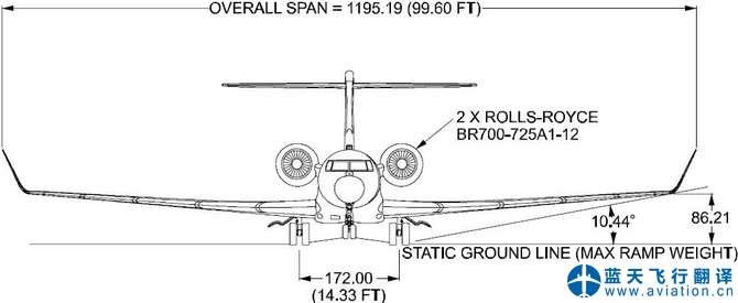 ![]() 灣流G650尺寸 G650 Dimension ![]() ![]() 灣流G650尺寸 G650 Dimension ![]() 灣流G650飛機(jī)操作手冊 G650 Aircraft Operating Manual G650以16100磅推力的(71.6千牛)羅爾斯-羅伊斯公司BR725發(fā)動(dòng)機(jī)為動(dòng)力,該發(fā)動(dòng)機(jī)比BR710(G550的動(dòng)力)功率大4.6%。新的后掠葉片風(fēng)扇減小燃油燃燒和噪聲,而新的燃燒室降低排放。首飛定于2009年下半年,2011年獲美國和歐洲合格證,2012年進(jìn)入服役。2012年飛機(jī)交付時(shí)的完成價(jià)5850萬美元,2013年開始從5850萬美元起價(jià)。