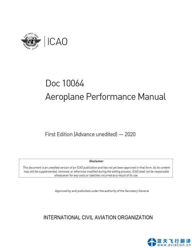 北京藍天飛行翻譯公司承接國際民航組織飛機性能手冊翻譯任務 INTERNATIONAL CIVIL AVIATION ORGANIZATION, Aeroplane Performance Manual Translation